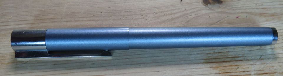 The pen itself is an attractive design by Sieger Design which adheres to the Lamy Bauhaus philosophy. It is an apparently simple tubular pen with the cap being slightly wider than the barrel. The chrome plated finials merge in with their sections and are separate pieces. Running a finger along the transitions, no gap can be felt on the barrel, whereas there is a very slight step down from the cap to the finial, not that you’d normally ever hold or feel the pen here. The pen is quite long, making it appear thinner than it actually is.