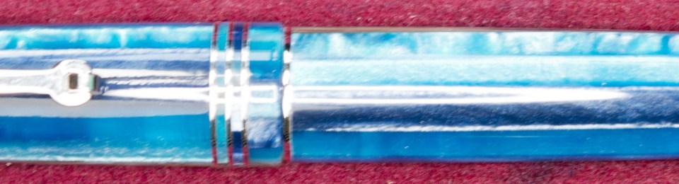 The body is adorned by five rhodium plated rings. One between the blind cap and the barrel, three towards the bottom of the cap and one at the end of the barrel where the cap meets the body. The affect does work with the body and the colour of these plus the clip matches well the blues and browns of the resin.