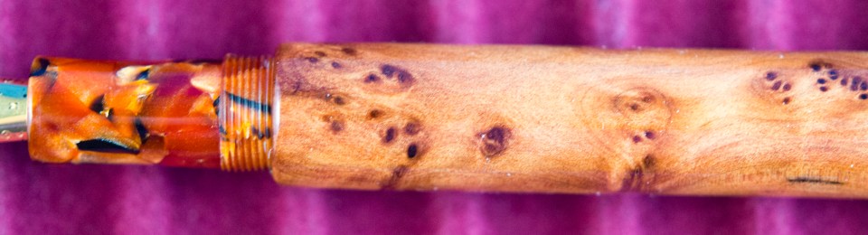 While describing the pen as cigar shaped, the rounded ends make this more so. The wood is thuya burl, which I believe is from the US. It is used for the cap and the barrel and has a waxed finish. The grip section and the threads are from a rod of Conway Stewart Bracket Brown resin., which is well matched. The wood has been wax finished, which helps bring out the colour and grain while protecting it, however it also takes some of the warmth away from the touch (which is unfortunate as that is part of the appeal of wooden pens to me). The patterning is different from many of the European woods, with dark splodges that almost look like bear cub paw marks. Interestingly if you hold the open cap or barrel up to the nose then you can smell the wood – it almost reminds me of a stronger version of pencil shavings (ah, those child hood memories 😯 ).