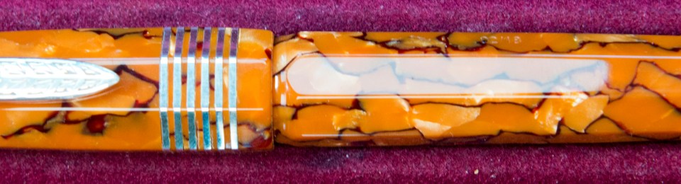 The celluloid is toffee brown in colour (to me anyhow) with a cracked ice effect. There is quite a deep pearlessense or chatoyance in some of the lighter ‘chips’, which creates a glittering type effect when then pen is rotated. The facets create eight sides on all bar the grip area, which is round from the nib all the way back to beyond where there is an obvious change in component pieces.