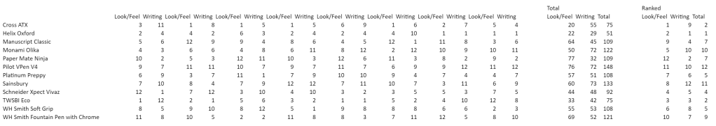 Scoring was based on order preference. Thus a lower over all score the better the pen was seen to be. I had two measures, first the look and feel, second the writing experience. Here is where I did make a mistake, but one I only spotted when the third tester asked why I did not score looks and feel separately. By this time it was already too late, and the first two reviewers were not going to be seen again for a fair while.