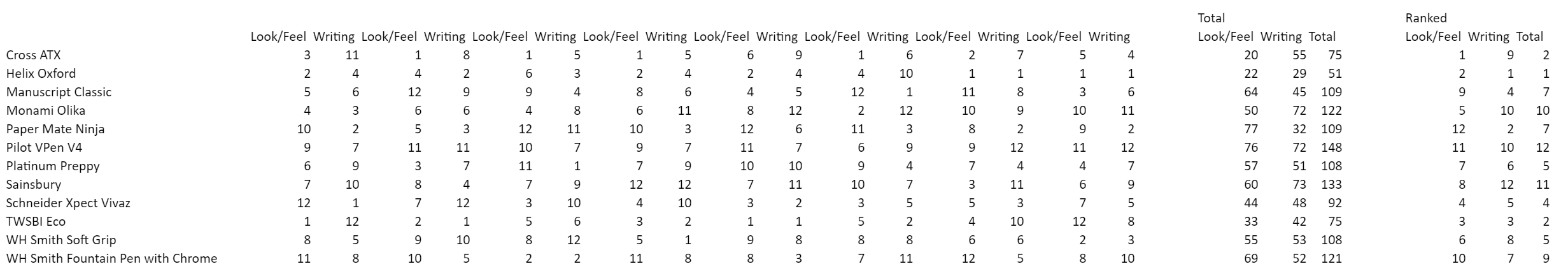 Scoring was based on order preference. Thus a lower over all score the better the pen was seen to be. I had two measures, first the look and feel, second the writing experience. Here is where I did make a mistake, but one I only spotted when the third tester asked why I did not score looks and feel separately. By this time it was already too late, and the first two reviewers were not going to be seen again for a fair while.