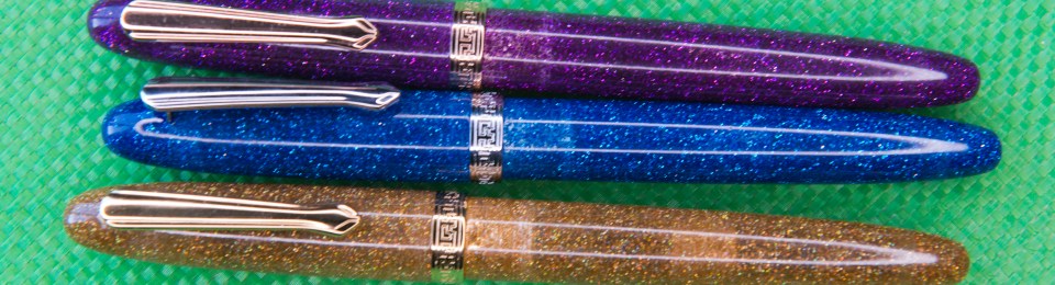 I’m going to admit it. I actually quite like the look of these pens. Sure the glitter in the resin may remind me of tinsel and it is that time of year, but their appearance does bring a smile to my face. Subtle these pens are not. The cap comes off in just 1.5 turns and does not post. At first it appears it should but it is not secure and the cap falls off with the slightest of movement. I think it is a combination of the shape and the material as this does feel slightly slippery compared to the resin used with my Schuykill. The caps do seal well and I have seen little to no sign of ink evaporation with all three pens.
