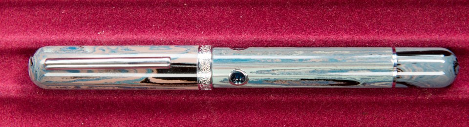 Certainly visually this is an interesting pen.  Cigar shaped with the cap being wider than the barrel.  The ‘porthole’ ink windows sit at 120 degrees to each other and nicely break up the barrel.  The bright work contrasts with the body, though I do wish the cap finial and band could compliment each other, instead the former is plain and the latter highly decorated. Interestingly the engraving on the front and back of the band says Narwhal not Nahvalur, so I assume this pen was designed and made before the re-branding was decided upon, then released after. This infers the re-branding was a rushed job. Using the old boxes (though not with this pen) I can understand, but using the old name on a commissioned batch for a third party does not reflect well.