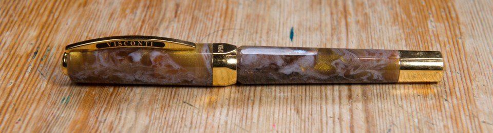 Well first off this is an attractive pen made of a striking resin. Translucent amber with lilac and grey swirls plus a dusting of golden particulate gives off an almost marble like vibe, though without the cold touch. Combined together with the golden coloured metal work and what we have here is very pleasing on the eye.